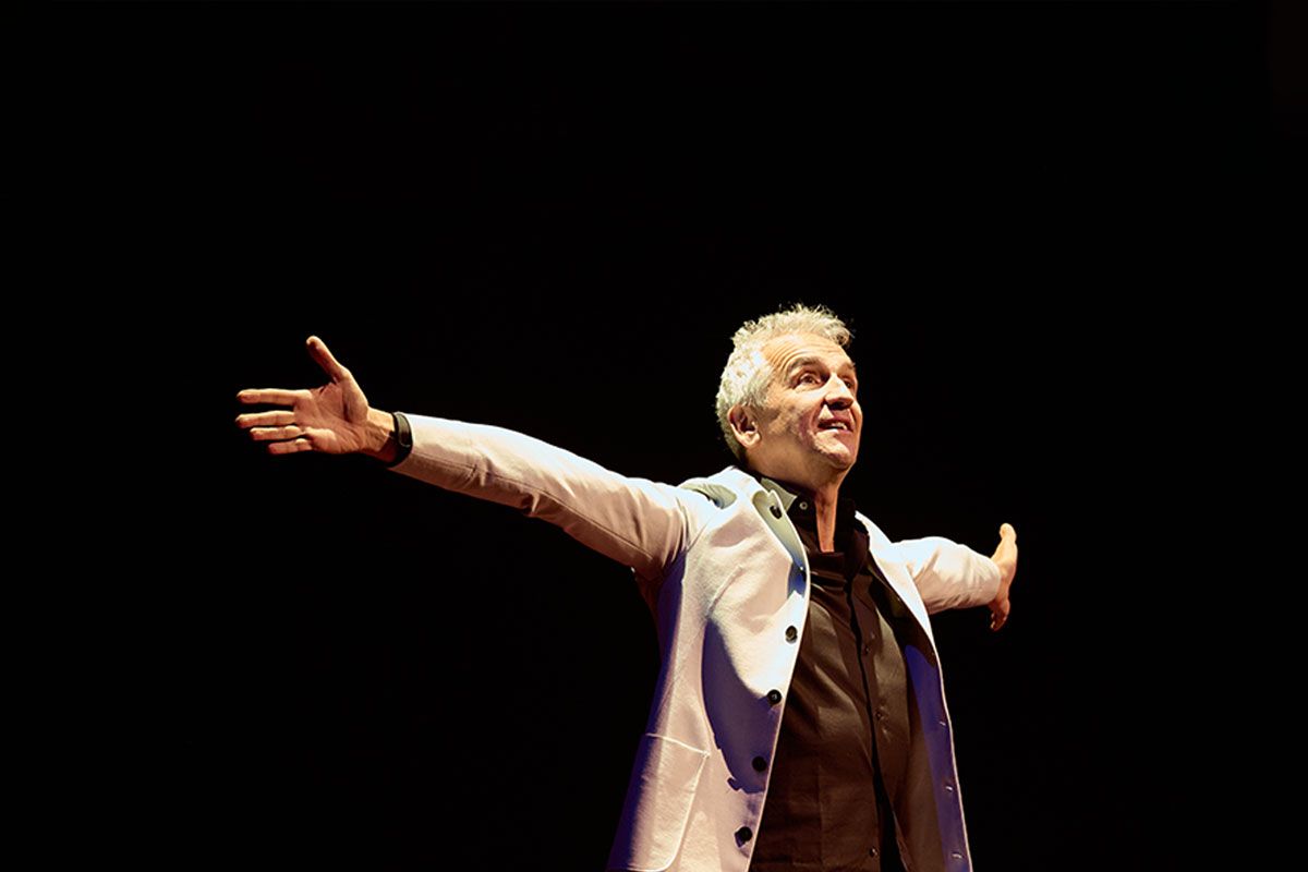 Je mène une vie scène est aussi l’occasion pour ce verbo-moteur de nous dévoiler ses états d’âme, ses états d’homme, son parcours de l’enfance à la scène en rendant au passage un hommage émouvant à Raymond Devos dont nous fêtons cette année les 100 ans de la naissance. Ce trublion mélancolique, ce détrousseur polisson de mots trop policés nous revient dans une forme olympique !
